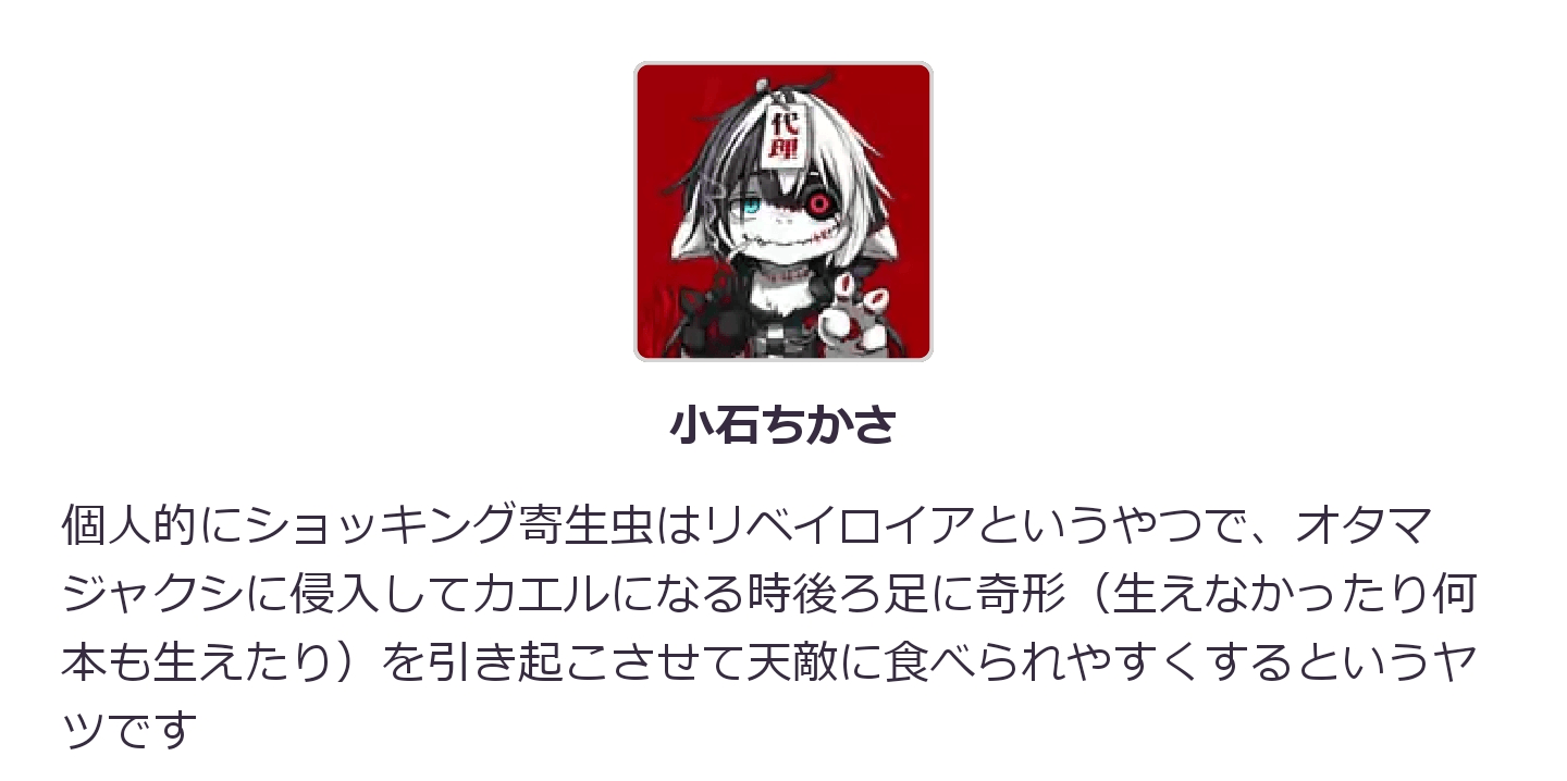 개인적으로 충격적이었던 기생충은 리베이로이아라는 녀석으로, 올챙이에게 침입해서 개구리가 될 때 다리에 기형(아예 안 나거나, 여러개가 나버리거나)을 일으켜서 천적에게 잡아먹히기 쉽도록 만드는 놈입니다.